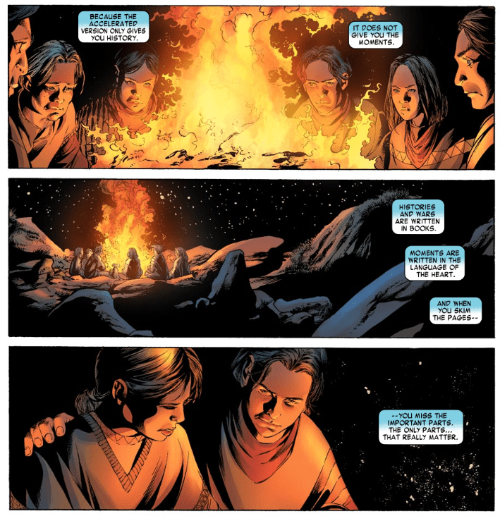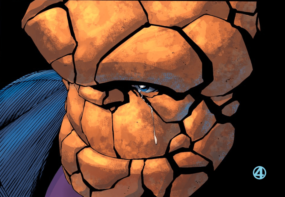 Reed returns to his lab, to study the miniature planet from the beginning of this story arc. He says it would be easy to interfere in their culture, ending war and bloodshed. He doesn’t, however, saying there’s a difference between history and the smaller moments in all our lives. He concludes that the smaller moments are the parts that really matter. Reed and Sue go off to bed, saying it’s good to see their whole family together, and looking so happy. Alone in his room, Ben sheds a single tear, suggesting that he’s not so happy after all.