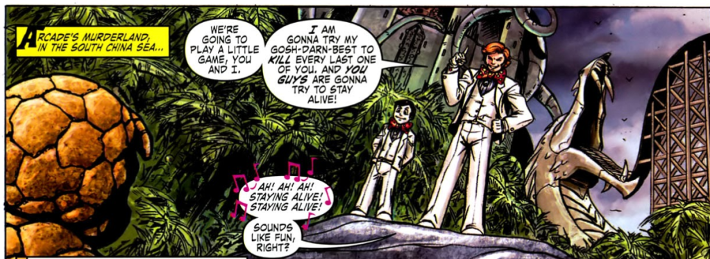 In issue #3, Tony Stark contacts Ben from the underground tunnels, saying the immunity zone is real and not one of Arcade’s tricks. Nighthawk and Constrictor call a truce. They fly in to help Ben. Then Tony makes a bunch of Thing robots appear to fight the Hulk robots. Then everyone makes it to “Murderland Studios,” where they fight robot facsimiles of famous movie characters. They get to the immunity zone, only to find it too small for everyone to stand on.