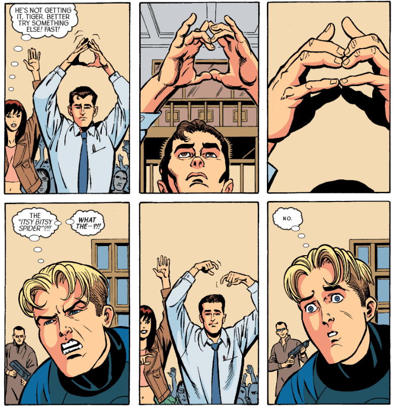 The situation looks dire, until Johnny sees Peter Parker in the crowd doing the “itsy bitsy spider” motions with his hands. Johnny figures it out, while Peter smiles and points at himself. Johnny flames on as a distraction, allowing Peter to web up the gunmen on high up balconies. They then work together to defeat the Maggia goons, and Johnny sky-writes a message for Peter, stating, “the usual place.”