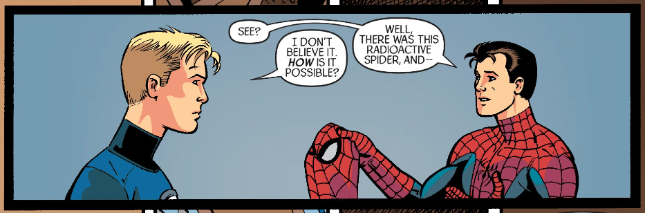 Fade out: Sue points out that while Spider-Man has visited the Baxter Building(s) on several occasions, he’d only been in the upper floors and never the main residence before.