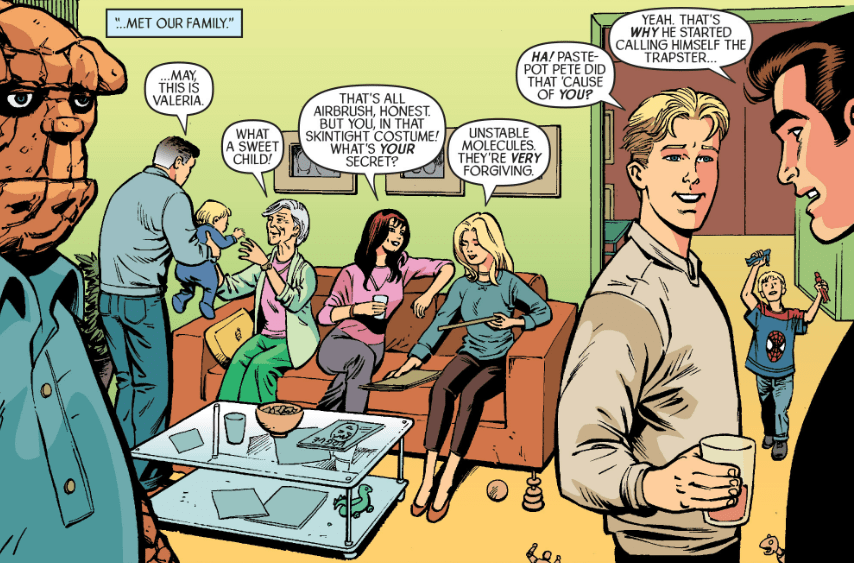 Cut to later, when a Fantasticar lands at the Baxter Building, containing Peter, Mary Jane, and Aunt May. These three are currently living at Stark Tower, but Peter says the Avengers are work while the FF are friends. Sue makes introductions, saying, “It’s past time your family met our family.” Cue several pages of the Parkers and the Richards hanging out for the evening, with lots of fun references to all their past encounters. Reed takes a group photo, saying he’ll file it under “friends and family.”