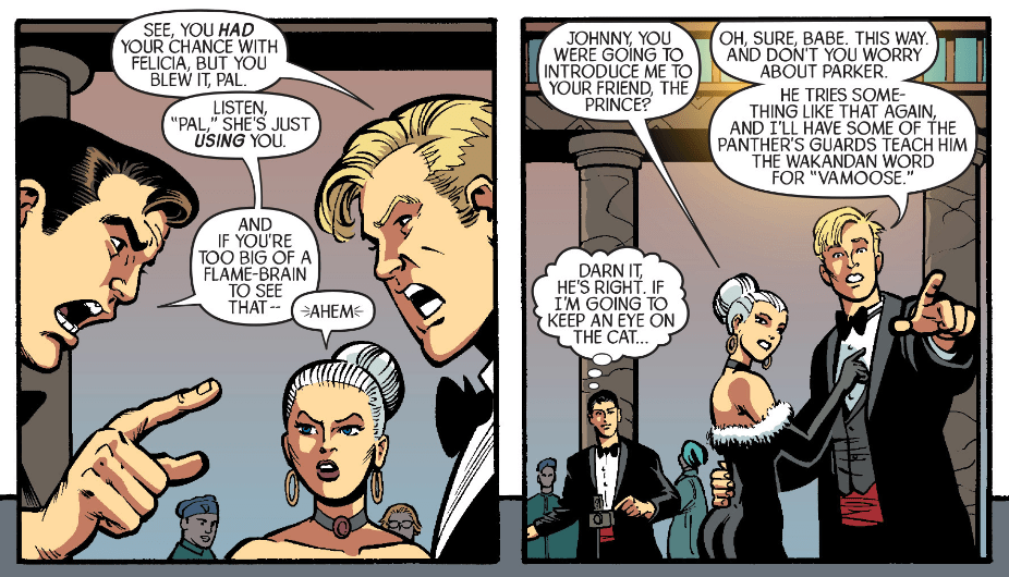 Issue #4 skips even farther ahead, during the short time in which Spider-Man wore the powerful alien costume, not yet knowing the costume was a living symbiote. Spider-Man’s new girlfriend Felicia Hardy, a.k.a. the Black Cat, wants to go to a party, so she can steal a Wakandan tribal mask her father once tried to steal. Peter doesn’t want to do it. They argue on a rooftop while Johnny eavesdrops, wondering how Parker knows Black Cat. When Black Cat walks away from Peter after being upset with him, Johnny confronts her.