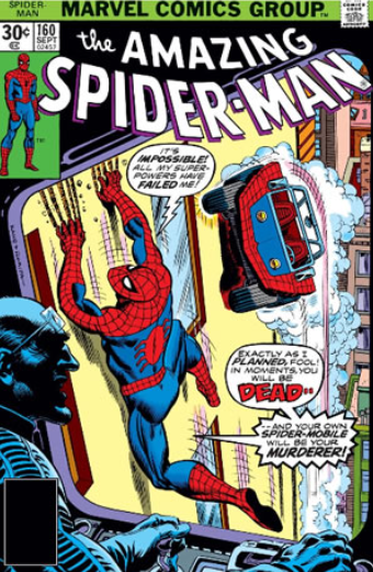 Trivia time: What’s the deal with the Spider-Mobile? Although he doesn’t need a car, Spider-Man made a deal with two advertising execs for a Spider-Mobile for some extra cash. (Behind the scenes, this was also Stan Lee’s deal for a Spider-Mobile toy.) He used the car to fight Hammerhead, Mysterio, and the Tinkerer. It later showed up at the Smithsonian, and Deadpool once stole it and renamed it the Dead Buggy.