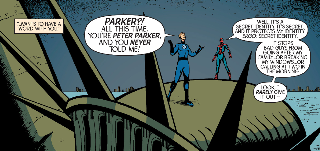 Fade out: Sue points out that while Spider-Man has visited the Baxter Building(s) on several occasions, he’d only been in the upper floors and never the main residence before.