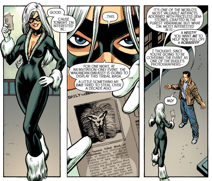 Felicia recruits Johnny into her heist, using his powers to shut down heat-seeking alarms. Alarms go off, and the guards find that the mask hasn’t been stolen. Black Panther fights Spider-Man, but Spidey uses the alien costume’s powers to make himself invisible so he can escape. He, Johnny, and Felicia reunite on another rooftop, where Felicia reveals she wasn’t after the mask, but her father’s lockpick, left inside the mask years earlier. Johnny is shocked to learn Spider-Man and Black Cat are a couple, when he thought she was dating Peter Parker.