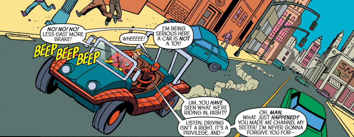 At the Daily Bugle, Robbie Robertson tells Peter that the paper doesn’t need photos of the FF, and he asks for new Spider-Man pics. Spider-Man goes to the Baxter Building where Johnny is working on… the Spider-Mobile! They go for a drive around NYC, remarking that no superhero would be able to get around Manhattan traffic. Then Spidey gets the idea of using Reed’s anti-grav device on the car, while having a heart-to-heart talk about Gwen’s death.