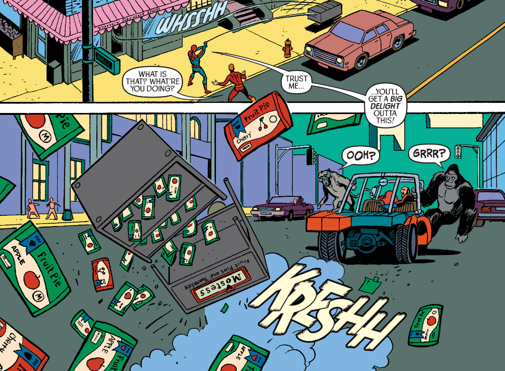 The Red Ghost and his Super-Apes break into Reed’s lab, but Johnny and Spider-Man have already taken the anti-grav device, driving the Spider-Mobile up and down skyscraper walls. The Red Ghost ambushes them and the apes drive off with the car. Then, get this: Johnny and Spidey stop the Super-Apes by distracting them with Hostess Fruit Pies (!!!). They then use the gravity machine to trap the Red Ghost. Reed lets Spidery use the machine one last time, allowing him to drive in circles on the wall outside J. Jonah Jameson’s office.