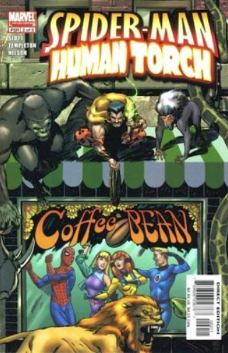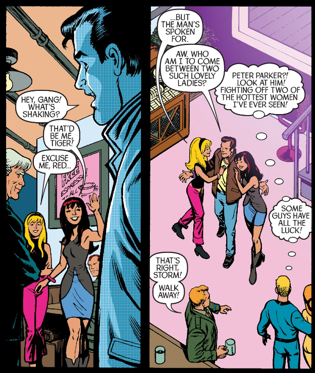 Issue #2 is sometime later, when Johnny was dating Crystal. They visit the Coffee Bean, a regular hangout spot for Peter, Gwen Stacy, Mary Jane Watson, and the rest. Flash Thompson flirts with Crystal, while Johnny can’t believe that both Gwen and MJ are smitten with Peter. Gwen’s dad, Captain Stacy, gives Peter a tip about super-villain activity nearby. Johnny and Spider-Man meet up outside, bickering about how the other one has it good. They decide to switch places for a day, with Johnny investigating Stacy’s villain, and Spider-Man joining the FF on one of Reed’s expeditions.