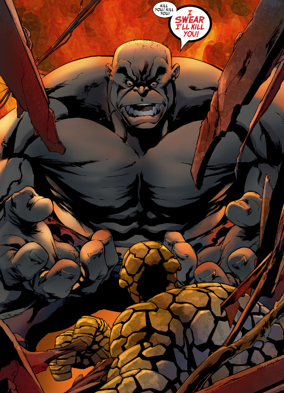 Ben confronts the Hulk again, saying he knows the Hulk doesn’t really want to hurt anyone. He offers to help Hulk deal with the gamma radiation. Upon hearing that, Hulk has another flashback, this time about Bruce Banner being told his wife Betty has gamma radiation poisoning. In his mind’s eye, Hulk sees Ben as the Abomination and blames him for Betty’s death. Hulk punches Ben through a building and then looms over him, saying “I swear I’ll kill you!”