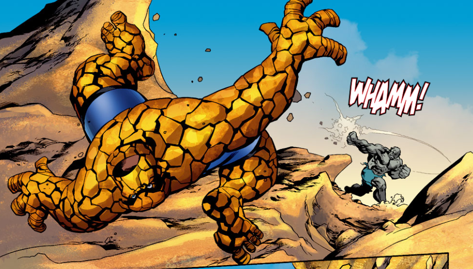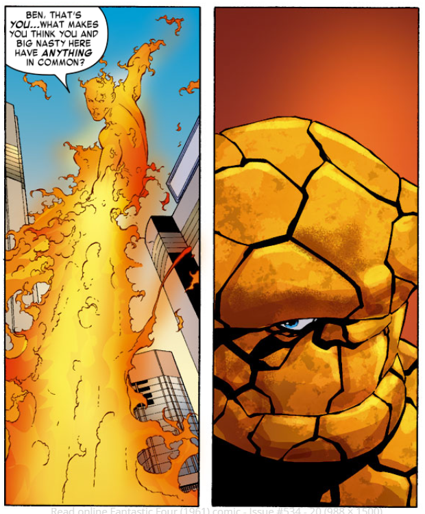 The Hulk smashes into a hospital. Seeing a patient in bed reminds him of the death of his friend Jim. Johnny and Ben find Hulk and fight him again, with the battle spilling onto the street outside. Ben tells Johnny to let up, saying the Hulk isn’t fighting them, but instead is only fighting the things he’s seeing in his head. He admits he feels the same way. He says whenever the FF go to space, he gets flashbacks to becoming a monster. “Monsters understand monsters, Johnny,” he says.
