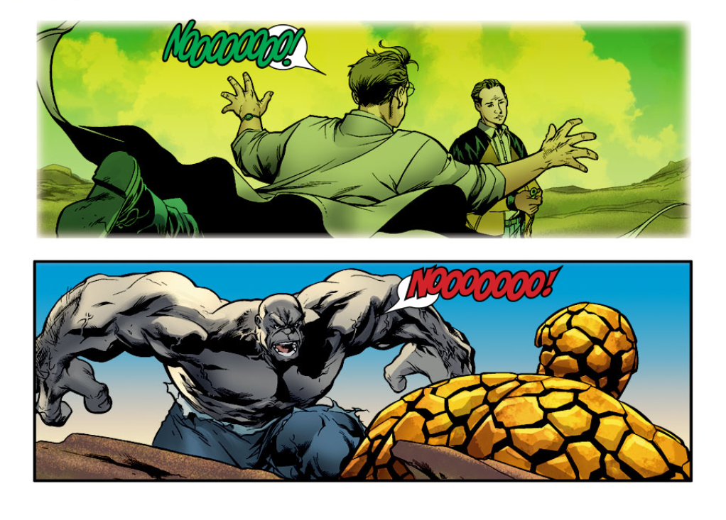 Recap: The Hulk, with Bruce Banner’s intelligence, went out to the desert with S.H.I.E.L.D. to diffuse a gamma bomb. Things went south and the bomb exploded, reverting Hulk from a brainy professor type to the classic brutish grey-skinned Hulk. Johnny and Ben flew out to Nevada to investigate, running right into this new/old Hulk.