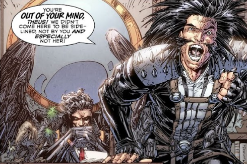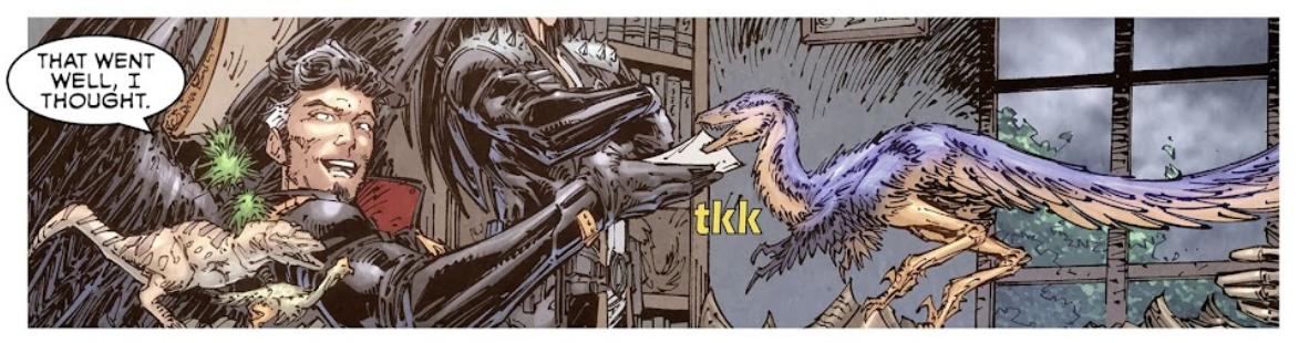 Issue #3 begins back with the villainous angels in their hideout, an old dinosaur museum. The leader Theon speaks, and it’s understood he’s talking to the same group from issue #1.