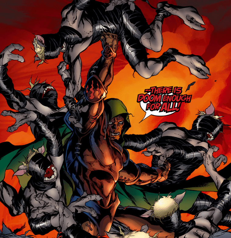 This issue begins with a caption telling us that no one has tried to lift the hammer yet. Then Reed speaks on behalf of the audience, asking how Doom is still alive. We flash back to Doom in Hell, where we last saw him. We see him weakened, yet still strong enough to fight off all the demons intent on tearing him apart. Then he has a vision of Ragnarok and the Asgardians dying. The battle is so great, Doom says, that rends the fabric of reality itself, causing a tear in Hell’s dimensional plane. He sees the hammer fly through the tear and he follows it back to Earth.