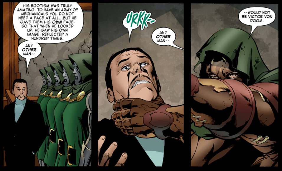 The flashback continues in Latveria, where the acting prime minister of the provisional government speculates that Doom will never return, and that he could make good use of all the leftover Doombots. Doom then returns, strangling the prime minister. He orders the other government goons to find where Thor’s hammer landed.