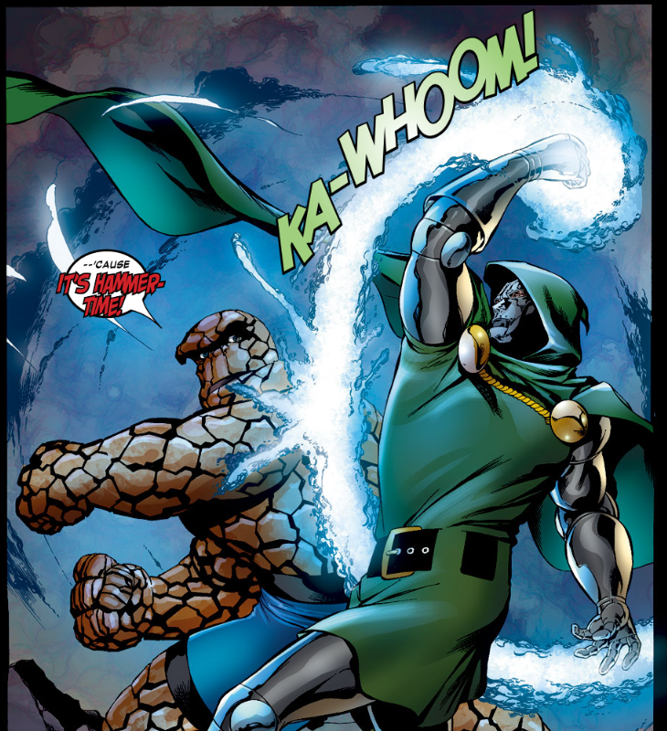 Cut back to the present. Instead of telling all this to Reed, Doom merely says, “It matters not.” He has the Doombots attack the FF while he strides toward the hammer, which is at the center of the crater left behind from last issue’s big explosion. Reed picks up Ben and throws him into the crater with orders to stop. Ben fights Doom, temporarily switching his catch phrase to, “It’s hammer time!”