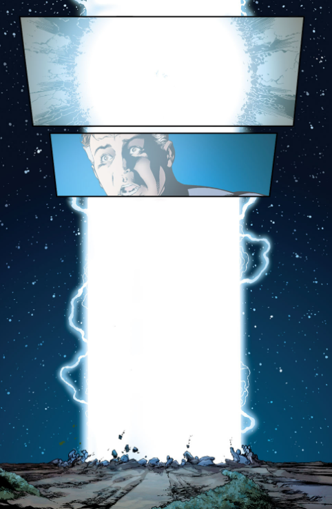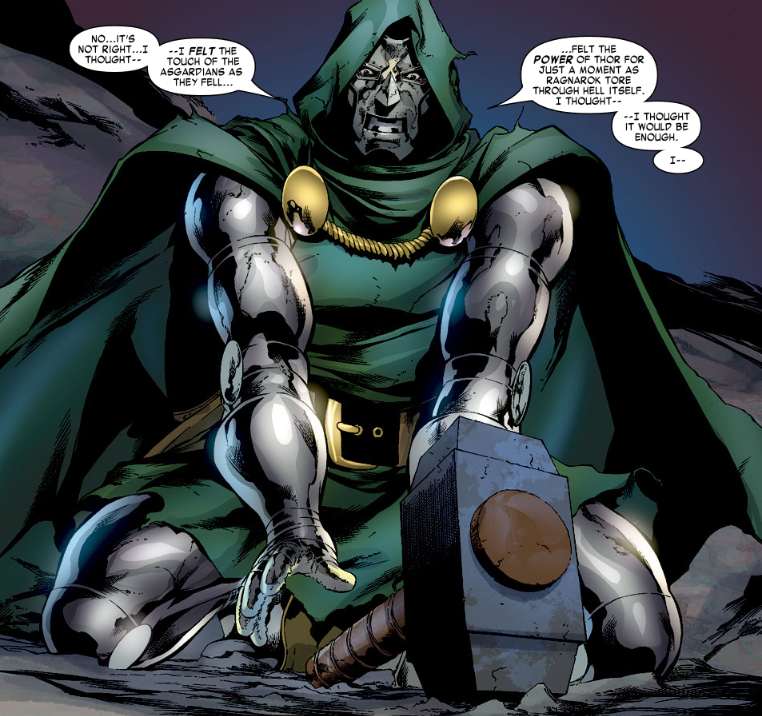 Doom stops Ben by blinding him with a bright light. Doom reaches for the hammer, and an even more spectacular white light fills the entire sky. When it fades, we see that Doom has failed to lift the hammer. Doom says he felt the power of Asgard when he witnessed Ragnarok, and he thought that would be enough to give him control of the hammer. “I was wrong,” he says.