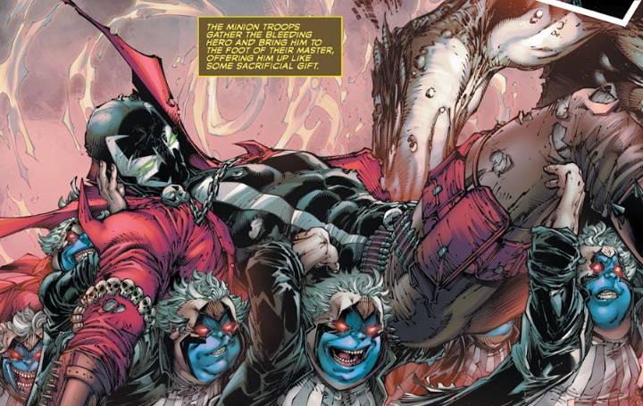 Continuing with issue #4, classic Spawn villain the Clown has Gunslinger cornered. Clown is multiple characters now, with a bunch of “baby Clowns” and a big Violator monster with him. Now, our time-displaced demonic cowboy anti-hero fights back.
