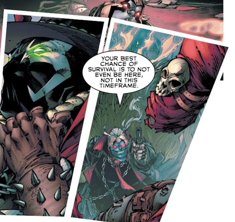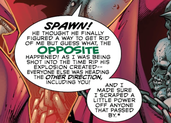 “Spawn! He thought he got rid of me, but the opposite happened! As I was shot into the time rip he created, I scraped a little power from everyone coming the other way. This includes you.”