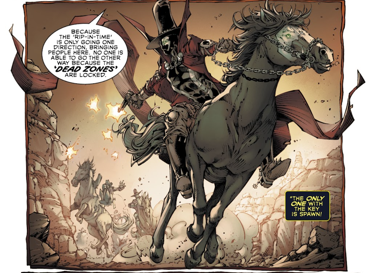 “The rip in time only moves in one direction, bringing people here. No one can go the other way because the dead zones are locked. Only Spawn has the key to them.”