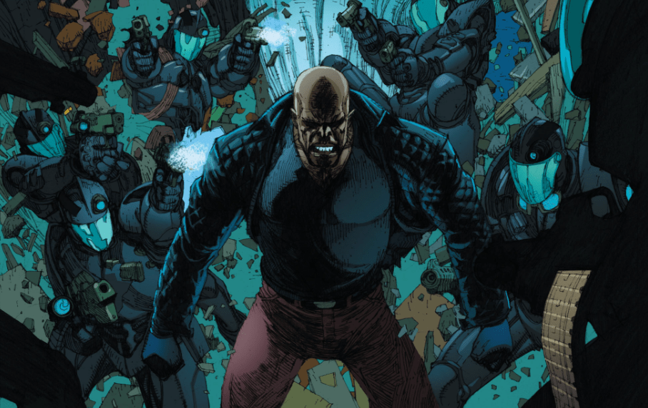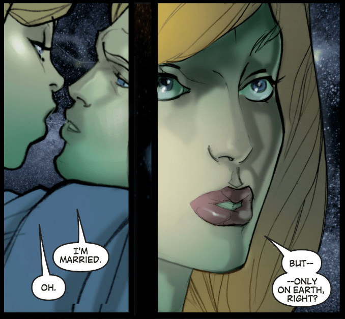 Then Crystal reveals that she and the Sentry once had a romantic fling, after she broke up with Johnny but before her relationship with Quicksilver. They share a passionate kiss, but Sentry breaks it off. He says, “I’m married,” only for her to respond, “But only on Earth, right?” Iron Man then shows up to recruit the Sentry, causing more tension between him and the Inhumans. Sentry agrees to join Iron Man’s team. Medusa (an alternate FF member) muses that the superheroes of Earth have no idea what’s in store for them after the Civil War ends.