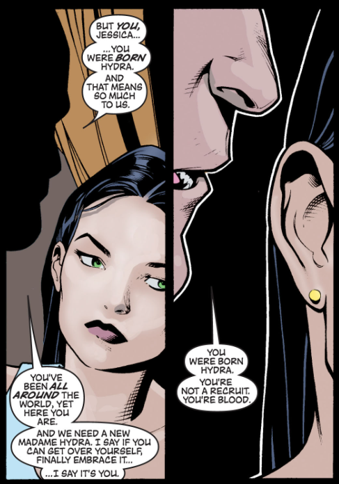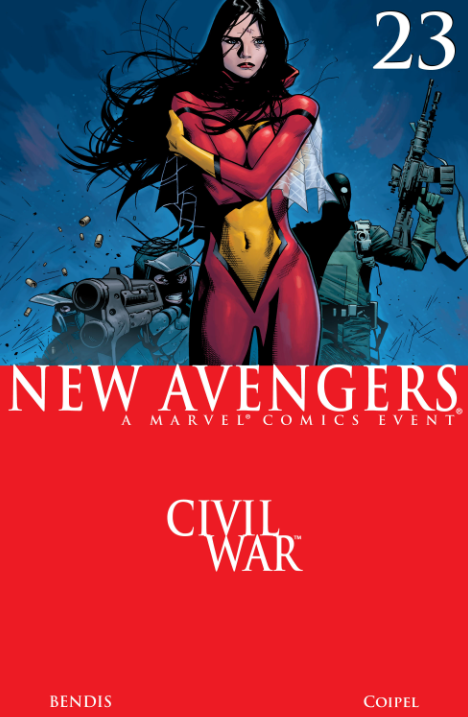 Spider-Woman was caught by S.H.I.E.L.D., and we’re told that she’s the first anti-reg superhero to be arrested. But then Hydra rescues her from S.H.I.E.L.D. in hopes that she’ll be Hydra’s new leader. She refuses, escapes from them, and joins Cap’s team. What makes this interesting is that this isn’t Spider-Woman, but a Skrull secretly plotting an invasion (a Secret Invasion, as it were). Marvel totally knew this at the time, and there a few Skrull-y clues throughout the issue.