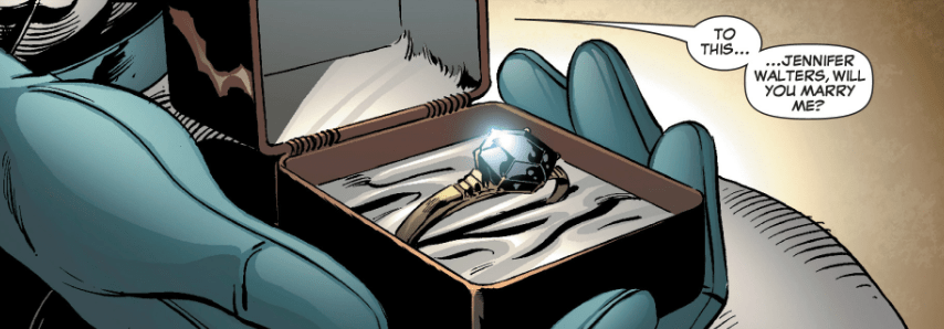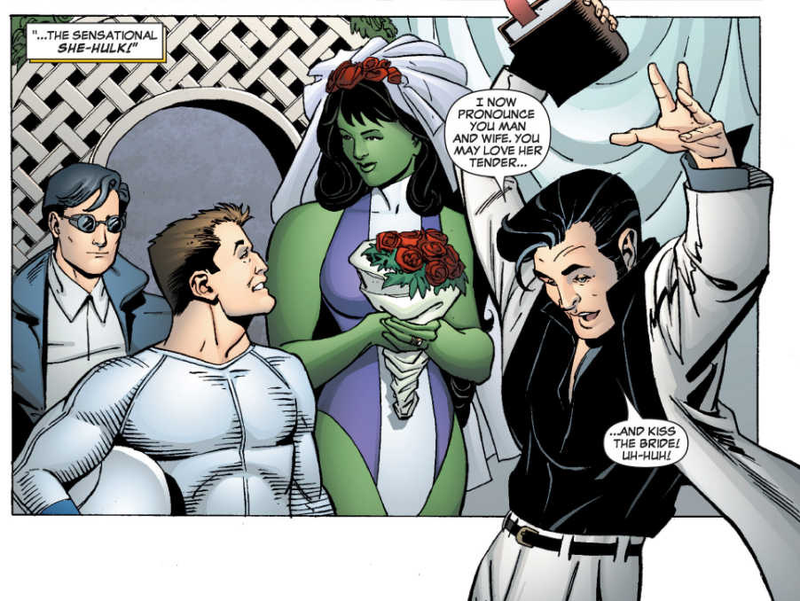 Meanwhile, She-Hulk’s current boyfriend John Jameson, astronaut and test pilot, is approached by Captain America. Cap wants John to convince She-Hulk to switch sides. John instead shows his loyalty to She-Hulk by proposing to her! Amusingly, J. Jonah Jameson learns about the engagement mere minutes after learning about Spider-Man’s secret identity! Poor Jonah’s had a rough day. She-Hulk and John are married in a quickie ceremony in Vegas. After that, the She-Hulk series drifts away from Civil War into more drama about her and John.