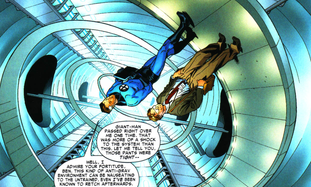 Unstable molecule: Reed and Ben Urich walk down some gravity-warped hallway inside the New Baxter Building, allowing them to walk on the ceiling. I have no idea why this is there, except for Reed to show off to visitors.