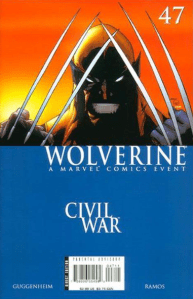 In the Wolverine solo series, issues 42-48, his status as a New Avenger makes him pro-reg, but he doesn’t dwell on that much. Instead, he learns that Nitro is still alive. You’ll remember Nitro is the explosive villain whose nuclear powers were behind the Stamford explosion, after the New Warriors attacked him. Wolverine goes searching for Nitro, eventually learning that Nitro had been given mutant growth hormone (!) at the time, which greatly enhanced his power.