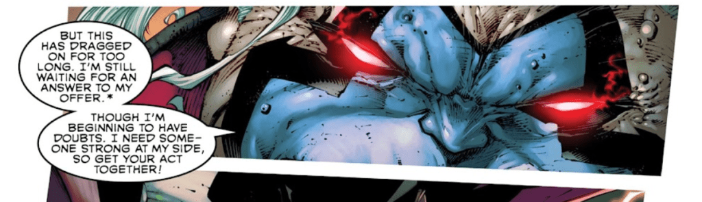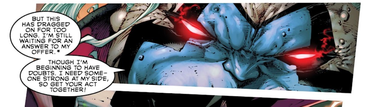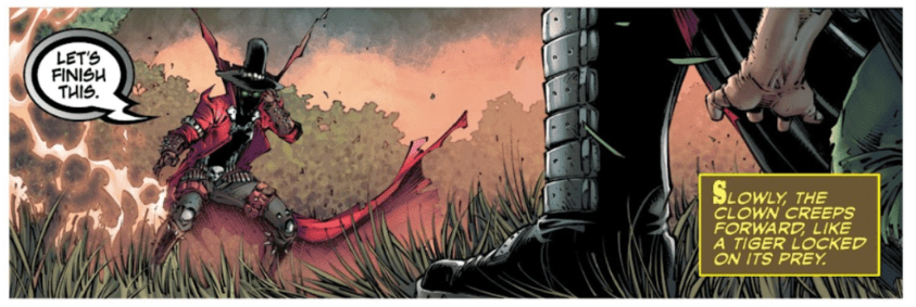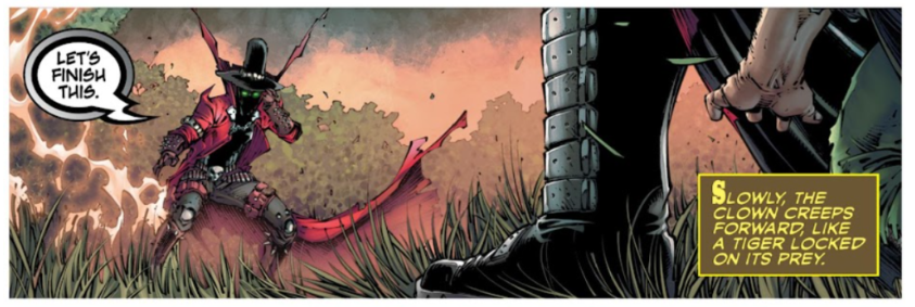 What on Earth is that comma in the first sentence? Delete it. I’m not sure about the “two titans” line. I get that Todd and co. want to make this huge and epic in readers’ minds, but is now the moment for this? Why not instead continue to emphasize how Clown is more powerful than Gunslinger?