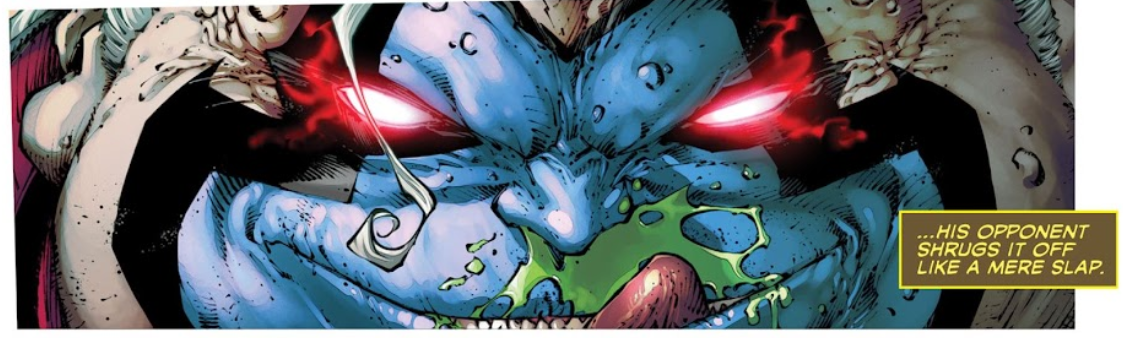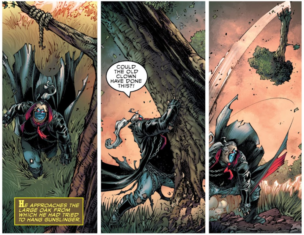Clown has a “Hulk smash” moment, hitting Gunslinger so hard it leaves a crater.