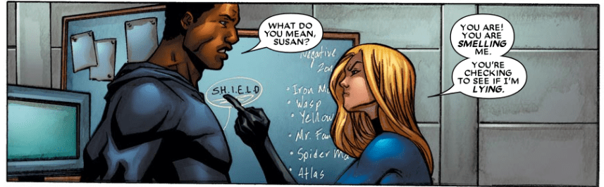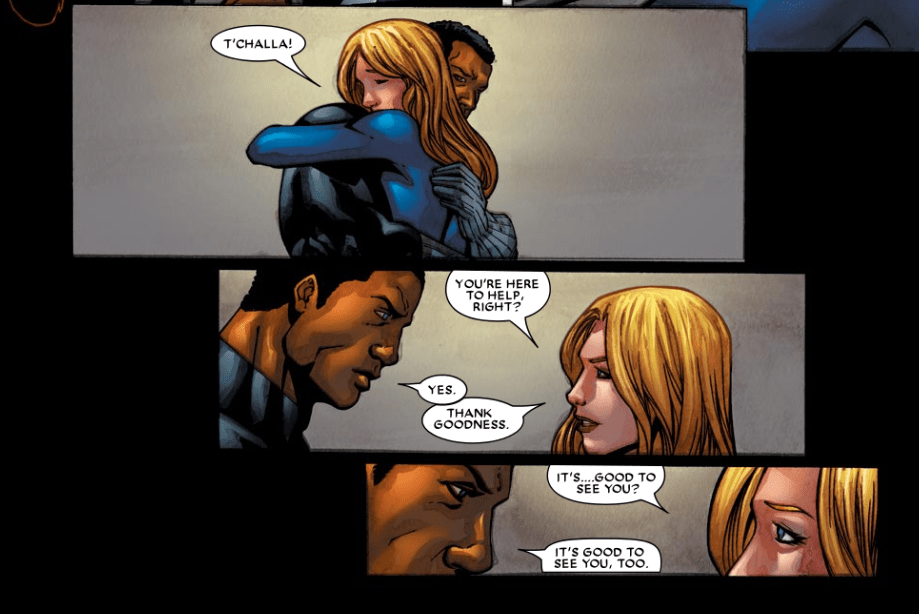 Fade out: Sue asks Black Panther not to talk about her children, because she’s been crying over missing them. Harsh.