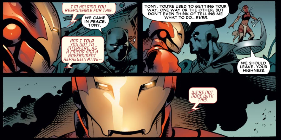 When anti-reg protestors outside the White House start getting out of control, Panther and Storm try to stop the violence, only to be attacked by Jim Rhodes piloting a Sentinel. Iron Man shows up and joins the fight, with Black Panther donning an Iron Man-ish armor suit of his own. They fight for a bit, only for Rhodes to break them up. Black Panther walks away from the battle saying that the US needs his help, and he’s not leaving.