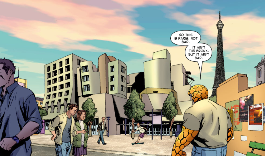 As the Civil War began, with all the superheroes battling and even killing each other in the streets over the Superhuman Registration Act, Ben chose to follow the path of the ex-pat by leaving the US for France. After talking about this for a while, and then incongruously fighting alongside Iron Man’s team against Captain America’s side in Civil War #3-4, in this issue, Ben finally arrives in France.