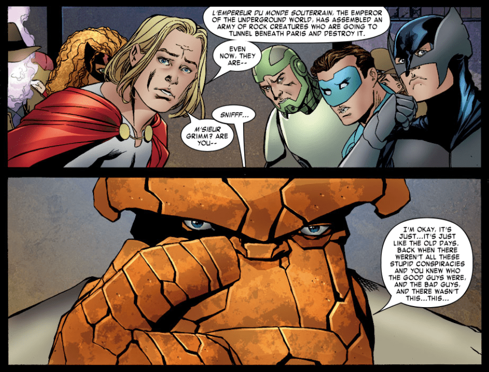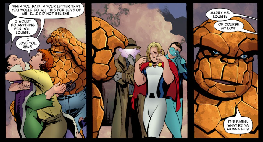 Paris is saved, and the Emperor’s lady friend appears. She forgives him, he proposes, and just like that they’re off to get married. Ben responds, “It’s Paris. What’re ya gonna do?” The issue ends with the superheroes heading off for another meal. Ben does his version of the line from Casablanca (which is actually Morocco, but does reference Paris), “I got the feeling that this is the beginnin’ of a wonderful friendship.”