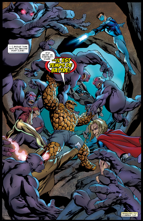 Clobberin’ time: Ben’s catch phrase in French is “Il est temps de battre!” The caption tells us this means, “It’s clobberin’ time!” I’ll take their word for it.