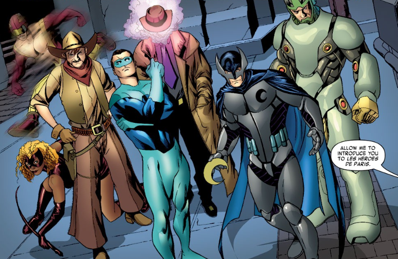 Ben finally arrives in Paris, where he goes out to see the sights. People are rude to him when he asks for restaurant tips. He gets an outdoor table at a small café (because it’s France, you know) only to fall through a trap door into some underground complex. There, he meets Adamantine, a Superman-like character who calls himself “commander in absentia” for a group called The Heroes of Paris. Adamantine says the city is in danger and needs his help. Ben then meets the rest of the Heroes of Paris, who are somewhat similar to DC’s Justice League: