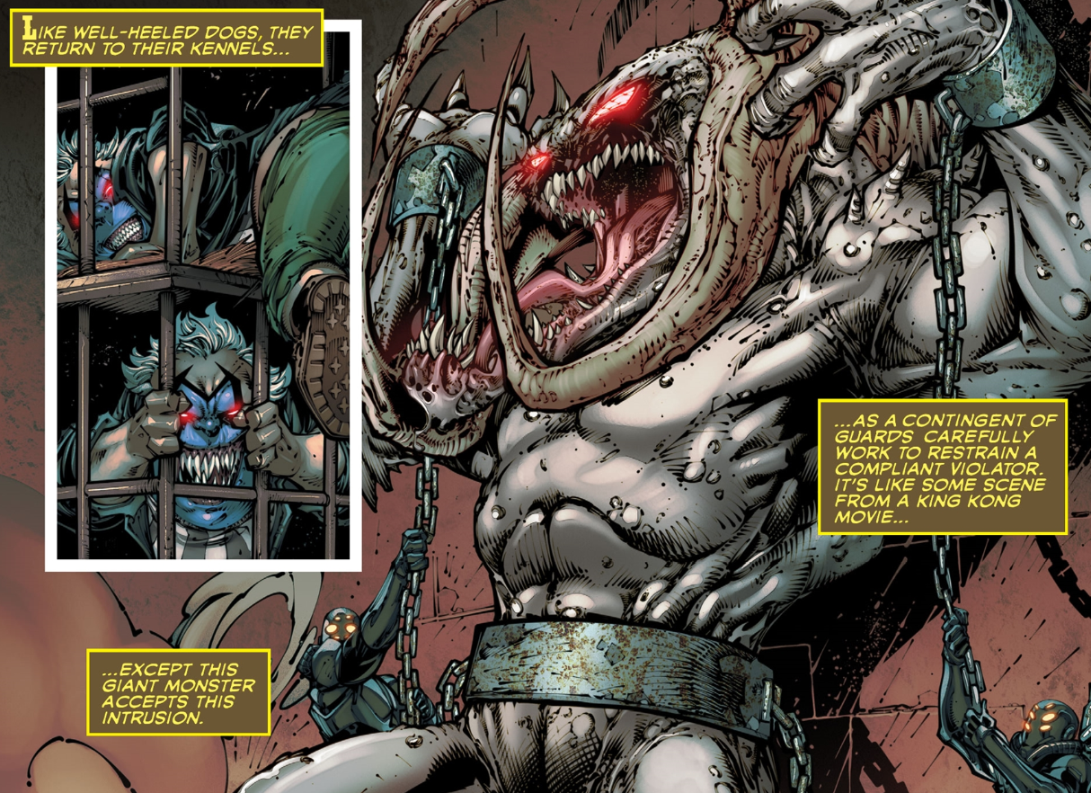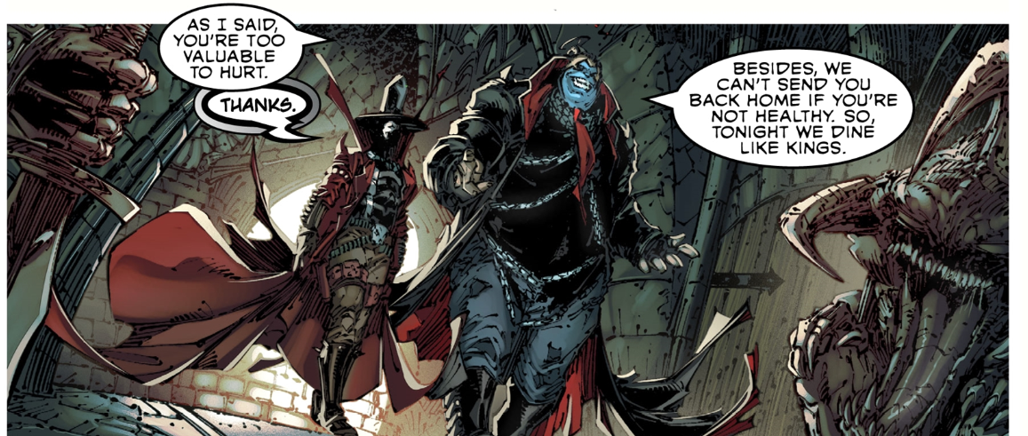 They’re in an otherworldly place called Omega Island. We don’t get a good look at the place, but apparently it’s been seen in previous Spawn comics. Clown’s robotic servants lock up his monstrous other selves.