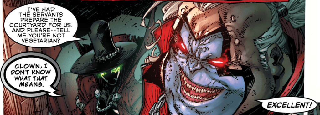 Clown reveals the dinner table, setting up this issue’s whole “My Dinner with Clown” vibe.