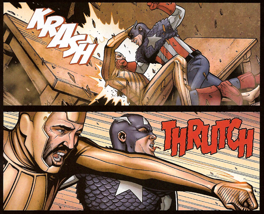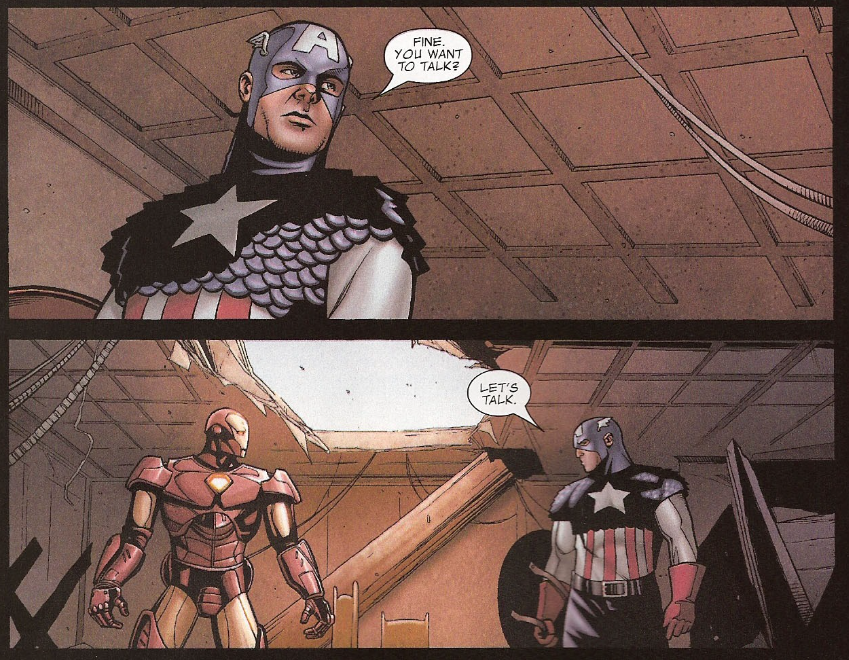The conversation goes on and on, referencing more and more of their shared experiences, and morally tough decisions they’ve both made in the past. Eventually, Iron Man sheds his armor so he’s only wearing that yellow jumpsuit thing he has on underneath, and Cap throws aside his shield. They go at it hand-to-hand, except Iron Man was taught to fight by Cap himself, and he keeps up with Cap’s blows. Cap eventually gets the upper hand, but stops himself from delivering the final blow. He leaves Tony there, saying “We should have talked sooner.”