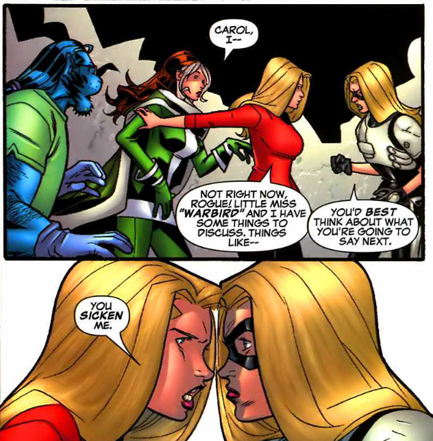 Later, Carol confronted figures from her past, including Rogue of the X-Men and an alternate-universe of her previous identity as Warbird. This doesn’t seem to relate to Civil War except for the basic question of, “What if the superheroes fought each other?”