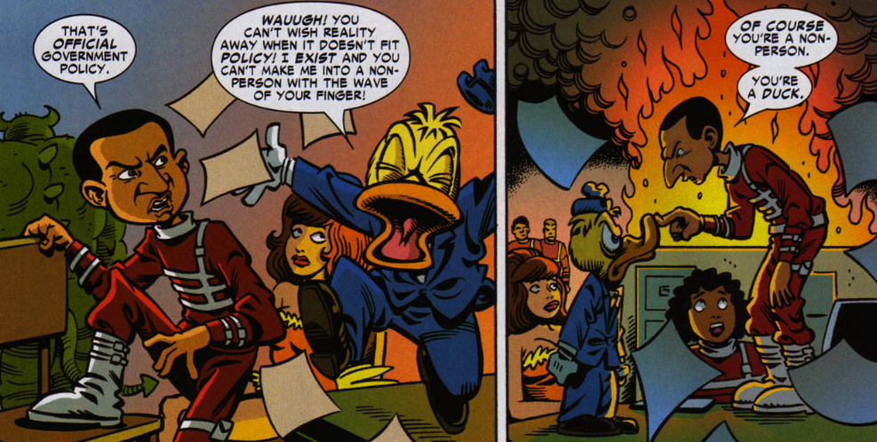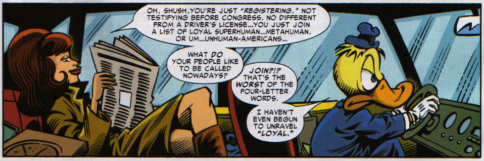Not even Howard the Duck could escape the enormity of Civil War. As an alien living on Earth, Howard is technically superhuman. So, in his Choosing Sides story, he goes down to City Hall to register. After waiting in line and dealing with mismanaged bureaucracy, he concludes that the real Civil War is people not being civil to one another. In the end, he learns that S.H.I.E.L.D.’s official stance on him is to deny the existence of a “duck man of Cleveland.” Although angry at first, Howard is okay with the idea of being a non-person, because now he doesn’t have to worry about things like jury duty or unpaid parking tickets.