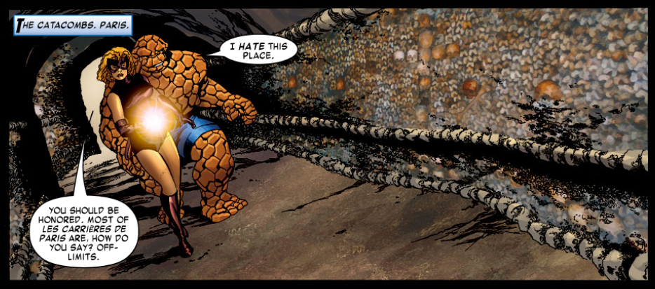 Recap: The Marvel Universe is divided in half over the issue of superhero registration, and whether superhumans should reveal their secret identities to the government and take part in Iron Man’s new Fifty States Initiative. The fighting and chaos has become so extreme that collateral damage is like nothing else seen before. The Fantastic Four are divided on the issue, with Reed being unwaveringly pro-reg. Sue and Johnny, being anti-reg, have left the team. Ben, while technically pro-reg, has left for France to be an “ex-pat,” leaving the superhero vs. superhero fighting to others.