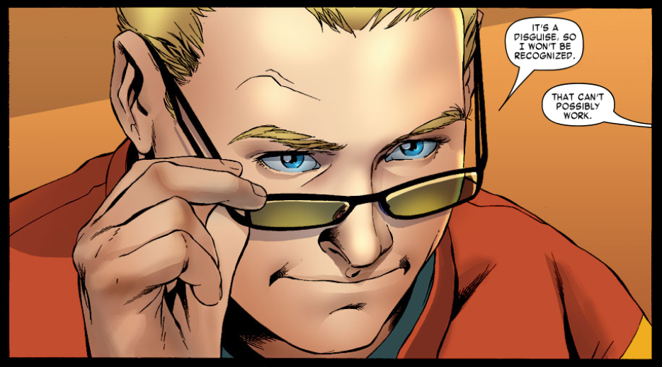 This issue begins with Johnny and Reed having a clandestine meeting inside a Starbucks-ish coffee shop. There’s a little poking fun at the “Clark Kent’s glasses” thing as Johnny wears glasses and Reed wears a fishing cap, and no one recognizes them. Their conversation goes on for five pages, but, honestly, it’s the same conversation all the characters have been having throughout Civil War. Reed says registration is the law and the law must be followed, while Johnny argues in favor of doing the right thing, the lawbooks be damned. He reminds Reed that they originally stole the FF’s rocket for their first spaceflight, while Reed argues that their powers gained from that spaceflight shouldn’t be allowed to run amok unchecked. They don’t see eye to eye, but Johnny agrees to follow Reed on an errand.