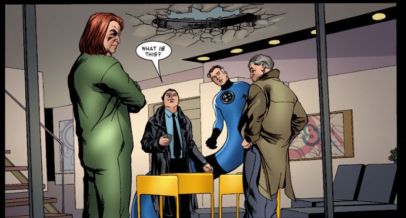 Reed, Johnny, and the Mad Thinker arrive at the new Baxter Building, where two agents from Damage Control are inspecting the building-wide hole left by Sue when she left Reed a few issues back. They say they can fix the hole, but it will take time because of the extra security in and around the building. (Other Civil War tie-ins have Captain America’s anti-reg team plotting to break into the Baxter Building at this time. The characters in this issue show no awareness of this.)