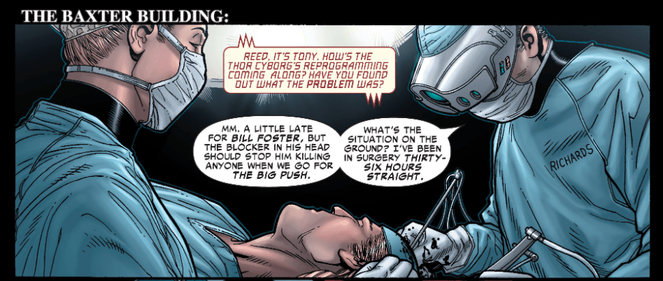 At the new Baxter Building, Reed performs surgery on the Thor clone, in hopes that it will be less likely to murder anyone in the future. Unbeknownst to Reed, the Punisher is also inside the Baxter Building, sneaking through all of Reed’s security drones by wearing a high-tech Stark suit. Punisher makes his way to Reed’s “data-house” where he discovers that security around the entrance to the Negative Zone prison is more extreme than any security he’s ever seen. Punisher contacts Captain America to say Cap will need a lot more help, and Cap says he’s working on it.