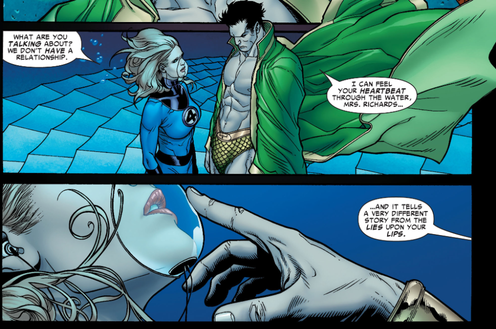Cut to Atlantis, where Sue is meeting with Namor. She says Captain America’s side is planning a big move, and Namor’s great power could be the decisive factor. Namor says the culprit behind the death of Namorita has been dealt with (this happened in the Wolverine tie-in issues). Sue argues that Cap is one of Namor’s oldest friends, as their partnership dates back to the old days of the original Invaders. Namor says Cap should have asked him in person, rather than using his and Sue’s unique relationship. Sue says she and Namor have no relationship, but he says he can sense her heartbeat in the water, and it says otherwise.