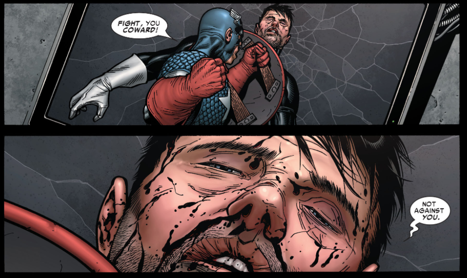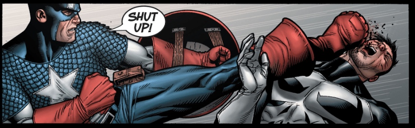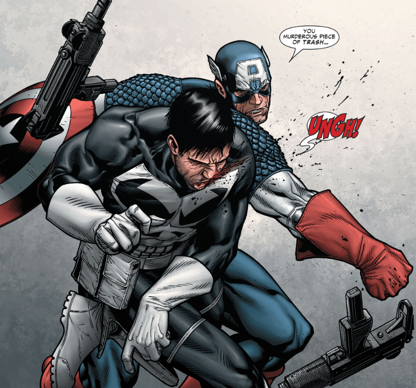 Then Captain America announces that two supervillains are willing to join their fight, Plunderer and Goldbug. Upon seeing the two villains, the Punisher doesn’t hesitate. He immediately goes for his guns and kills both of them, right in front of everyone. Cap punches the Punisher, calling him a murderous piece of trash, while Punisher argues the two guys were thieves and criminals. Cap beats the absolute crap out of the Punisher, but Punisher refuses to fight back. Cap asks why, and Punisher says, “Not against you.” Cap orders the others to throw Punisher out of there.