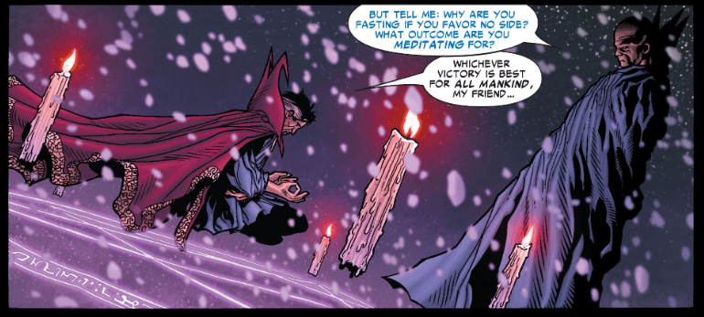 Then there’s a couple of short scenes checking with other corners of the Marvel Universe. If we’re to make some kind of timeline, all of this month’s tie-in issues would have to take place at this point. Tony Stark visits Connecticut to see a memorial built for those who died in issue #1. Dr. Strange continues to meditate in his North Pole hideout. The Watcher appears before him, and Strange says he hopes for whichever victory is best, and whichever spills the least amount of blood.