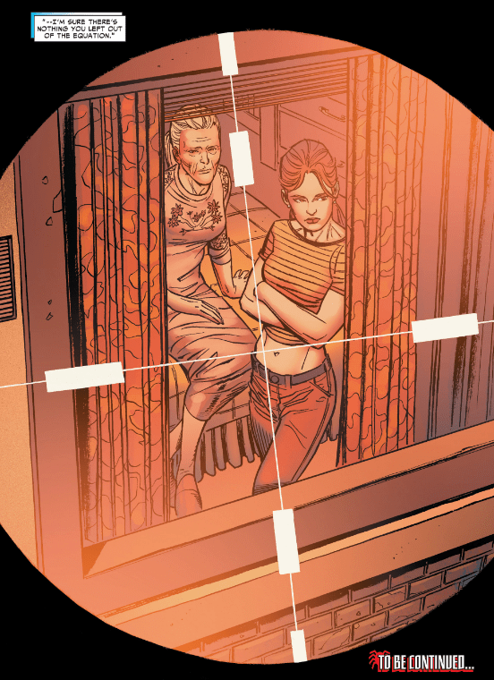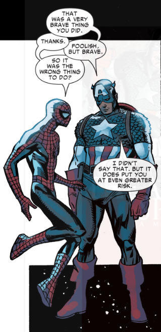 Captain America leaves for the meeting with Spider-Man, despite Falcon warning him it could be one of Iron Man’s traps. Cap and Spidey meet on a rooftop, and Cap gives a big speech, spending an entire page quoting a Mark Twain essay. He concludes that it’s not about governments or laws, but about the freedom to stand up for what you believe in. Spidey concludes, “It feels good to be on the right side again.” But the issue ends with a sniper across from the motel, with Mary Jane and Aunt May in his sights.