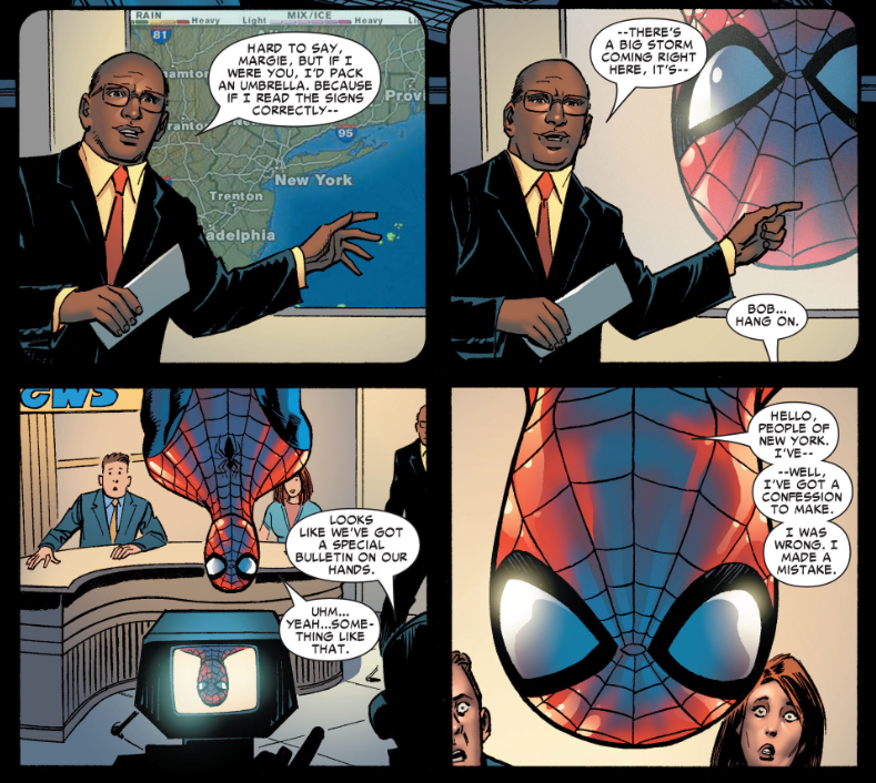 Spider-Man’s next stop is the nightly news, where he interrupts a live broadcast and gives a big speech. He informs the public that anti-reg heroes are being locked up in a Negative Zone prison without evidence or trial. He then announces that he intends to oppose anyone in favor of the registration act. Cut to Iron Man watching this on TV, who says, “Bring him in.”